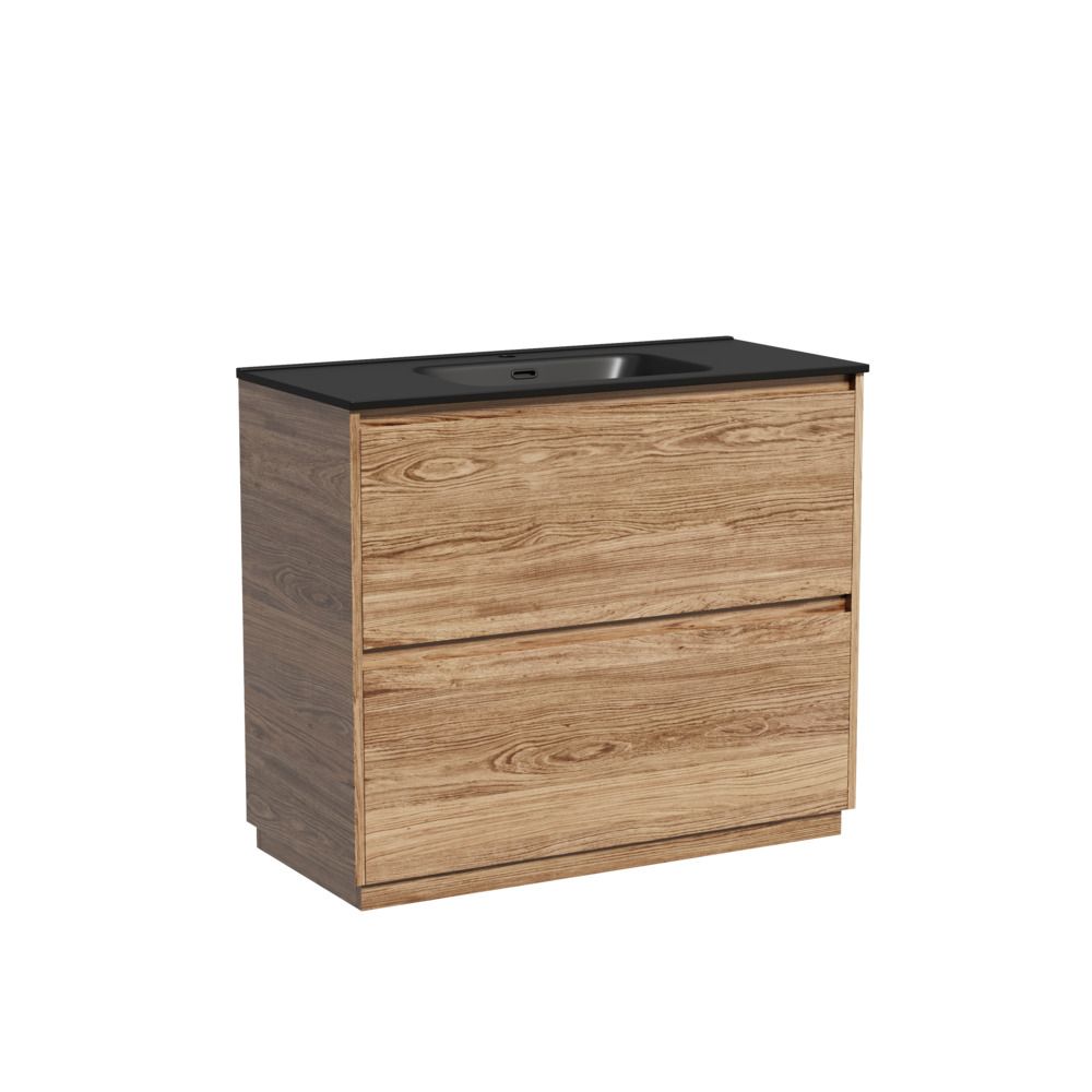 умба напольная Libra c двумя ящиками с доводчиками скрытого монтажа, с системой плавного закрывания и с ручкой по всей длине ящика. Каркас и фасад тумбы выполнен из ЛДСП в цвете «дуб чарльстон». Покрытие - ламинат. Основание тумбы имеет ножки c регулировкой высоты до10 мм для компенсации возможной неровности напольного покрытия. Внутреннее пространство тумбы выполнено из надежного ЛДСП серого цвета. Размер 990х450х840, артикул LB100FECH.