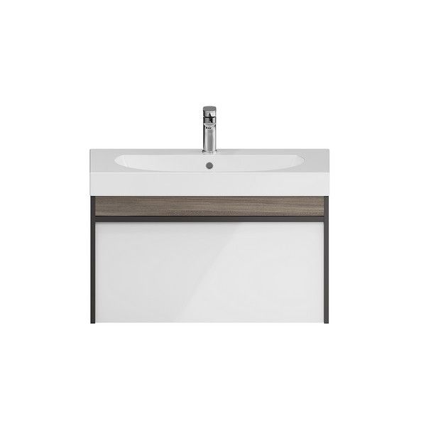 Мебель MODULA может быть использована для установки как мебельных раковин, так и любой из накладных, которые в этом случае устанавливаются на керамическую столешницу CANALETTO. Боковины тумбы выполнены в цвете «Арабика», фасад — белый глянцевый.
