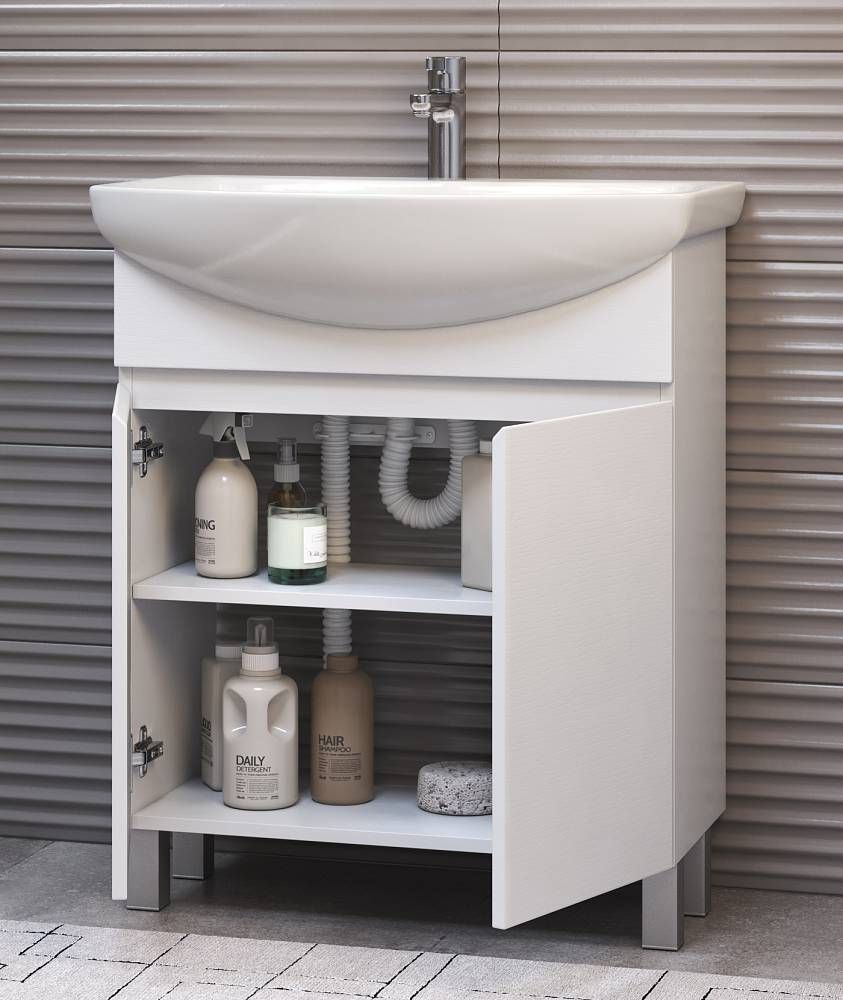2 дверцы, 1 полка ЛДСП, опоры регулируемые квадратные. Специальный сифон Vigo в комплекте.Материал корпуса и фасада: влагостойкая ЛДСПДверцы: петли с механизмом плавного закрыванияОтсутствие лицевой фурнитуры – интегрированная в фасад ручка