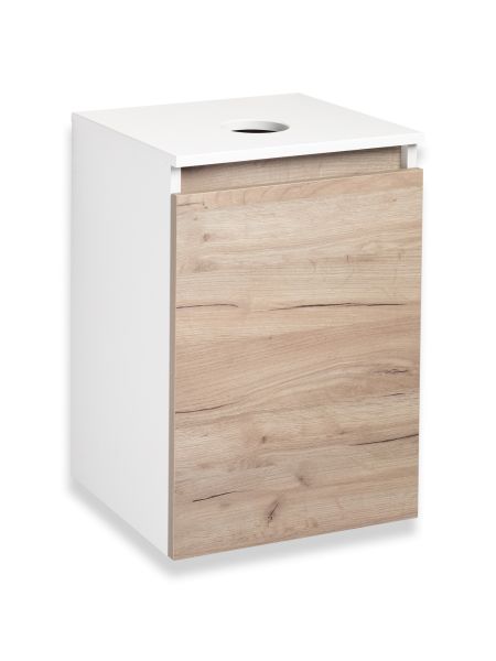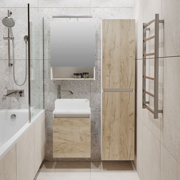 Тумба под раковину в ванную RUNO БАРИ (подвесная) - безупречное сочетание модных тенденций с классическим оформлением ванной комнаты. Тумба под раковину БАРИ оснащена распашной дверцей с правым открыванием. Цвет корпуса классический - белый, при этом цвет фасада в модном цвете – крафтовый дуб, идеально впишутся в любой интерьер ванной комнаты. К тумбе для ванной подойдут умывальники на столешницу: «UNO 24» (24х24см) – очень маленькая модель, идеально подходит для ограниченного пространства в небольших помещениях. Строгая квадратная геометрически правильная форма раковины, усиливает идею лаконичности в дизайне, устанавливается на столешницу, накладным методом. «DUE 38» (38х24см) – маленькая модель, идеально подходит для ограниченного пространства в небольших помещениях. Строгая прямоугольная геометрически правильная форма раковины с округлыми углами, усиливает идею лаконичности в дизайне, устанавливается на столешницу, накладным методом.
