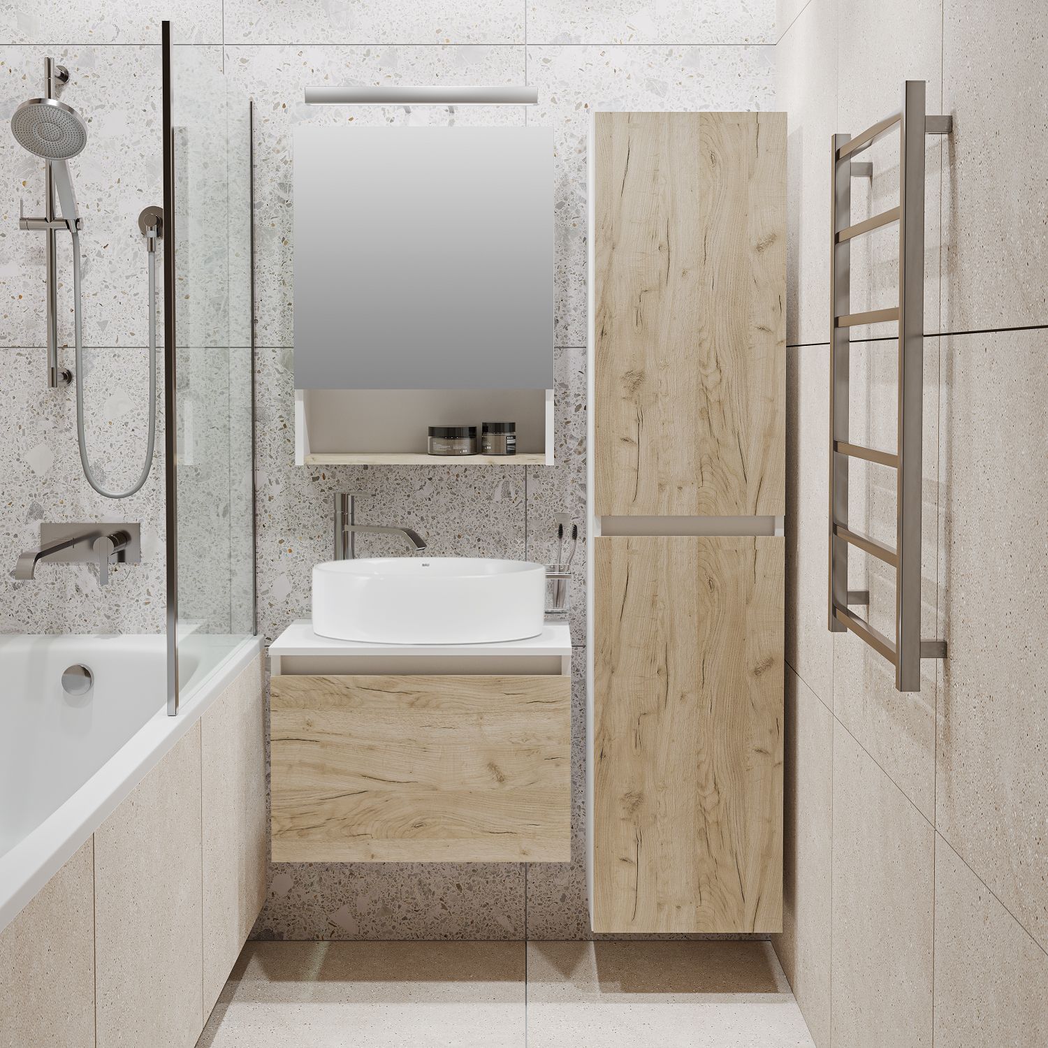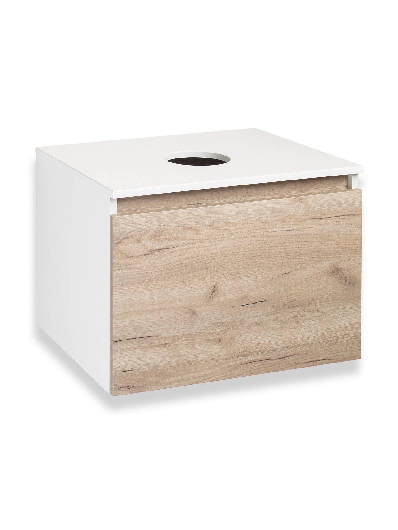 Тумба под раковину в ванную RUNO БАРИ (подвесная) - безупречное сочетание модных тенденций с классическим оформлением ванной комнаты. Тумба под раковину БАРИ оснащена выдвижным ящиком на шариковых направляющих, с системой плавного закрывания. Цвет корпуса классический - белый, при этом цвет фасада в модном цвете – крафтовый дуб, идеально впишутся в любой интерьер ванной комнаты. К тумбе для ванной подойдут умывальники на столешницу: «OVALE 50» (50х36см) - идеальное решение для стильного интерьера ванной, создан для минималистичных интерьеров и подойдёт для санузлов в стиле лофт, минимализм и хай-тек. Строгая овальная геометрически правильная форма раковины, усиливает идею лаконичности в дизайне, устанавливается на столешницу, накладным методом. «PALLA D41» (диаметр 41см) - идеальное решение для стильного интерьера ванной, создан для минималистичных интерьеров и подойдёт для санузлов в стиле лофт, минимализм и хай-тек. Строгая круглая геометрически правильная форма раковины, усиливает идею лаконичности в дизайне, устанавливается на столешницу, накладным методом. «TRE 48» (48х37см) - идеальное решение для стильного интерьера ванной, создан для минималистичных интерьеров и подойдёт для санузлов в стиле лофт, минимализм и Хай-Тек. Строгая прямоугольная форма с округлыми углами усиливает идею лаконичности в дизайне, устанавливается на столешницу, накладным методом. «TERZO 60» (59х39см) - идеальное решение для стильного интерьера ванной, создан для минималистичных интерьеров и подойдёт для санузлов в стиле лофт, минимализм и хай-тек. Асимметричная раковина, которую можно установить любой стороной, дизайнерское решение для нестандартных интерьеров, усиливает идею лаконичности в дизайне, устанавливается на столешницу, накладным методом.