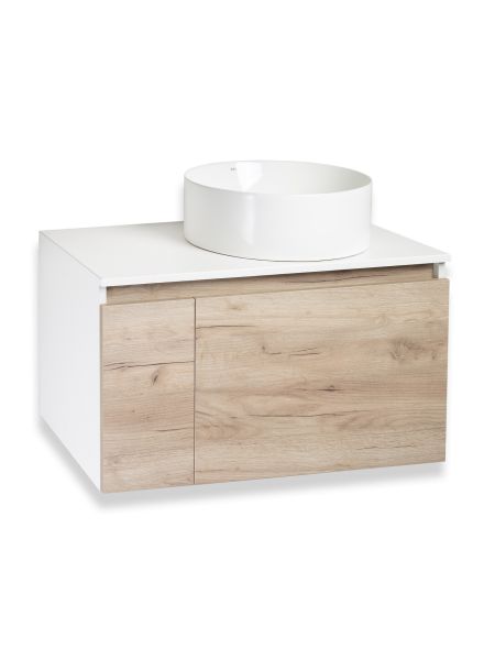 Тумба под раковину в ванную RUNO БАРИ (подвесная) - безупречное сочетание модных тенденций с классическим оформлением ванной комнаты. Тумба под раковину БАРИ оснащена выдвижным ящиком на шариковых направляющих, с системой плавного закрывания с правой стороны и распашной дверцей с левой стороны, дверца укомплектована двумя петлями верхняя с доводчиком, нижняя без доводчика. Цвет корпуса классический - белый, при этом цвет фасада в модном цвете – крафтовый дуб, идеально впишутся в любой интерьер ванной комнаты. К тумбе для ванной подойдут умывальники на столешницу: «OVALE 50» (50х36см) - идеальное решение для стильного интерьера ванной, создан для минималистичных интерьеров и подойдёт для санузлов в стиле лофт, минимализм и хай-тек. Строгая овальная геометрически правильная форма раковины, усиливает идею лаконичности в дизайне, устанавливается на столешницу, накладным методом. «PALLA D41» (диаметр 41см) - идеальное решение для стильного интерьера ванной, создан для минималистичных интерьеров и подойдёт для санузлов в стиле лофт, минимализм и хай-тек. Строгая круглая геометрически правильная форма раковины, усиливает идею лаконичности в дизайне, устанавливается на столешницу, накладным методом. «TRE 48» (48х37см) - идеальное решение для стильного интерьера ванной, создан для минималистичных интерьеров и подойдёт для санузлов в стиле лофт, минимализм и Хай-Тек. Строгая прямоугольная форма с округлыми углами усиливает идею лаконичности в дизайне, устанавливается на столешницу, накладным методом. «TERZO 60» (59х39см) - идеальное решение для стильного интерьера ванной, создан для минималистичных интерьеров и подойдёт для санузлов в стиле лофт, минимализм и хай-тек. Асимметричная раковина, которую можно установить любой стороной, дизайнерское решение для нестандартных интерьеров, усиливает идею лаконичности в дизайне, устанавливается на столешницу, накладным методом.