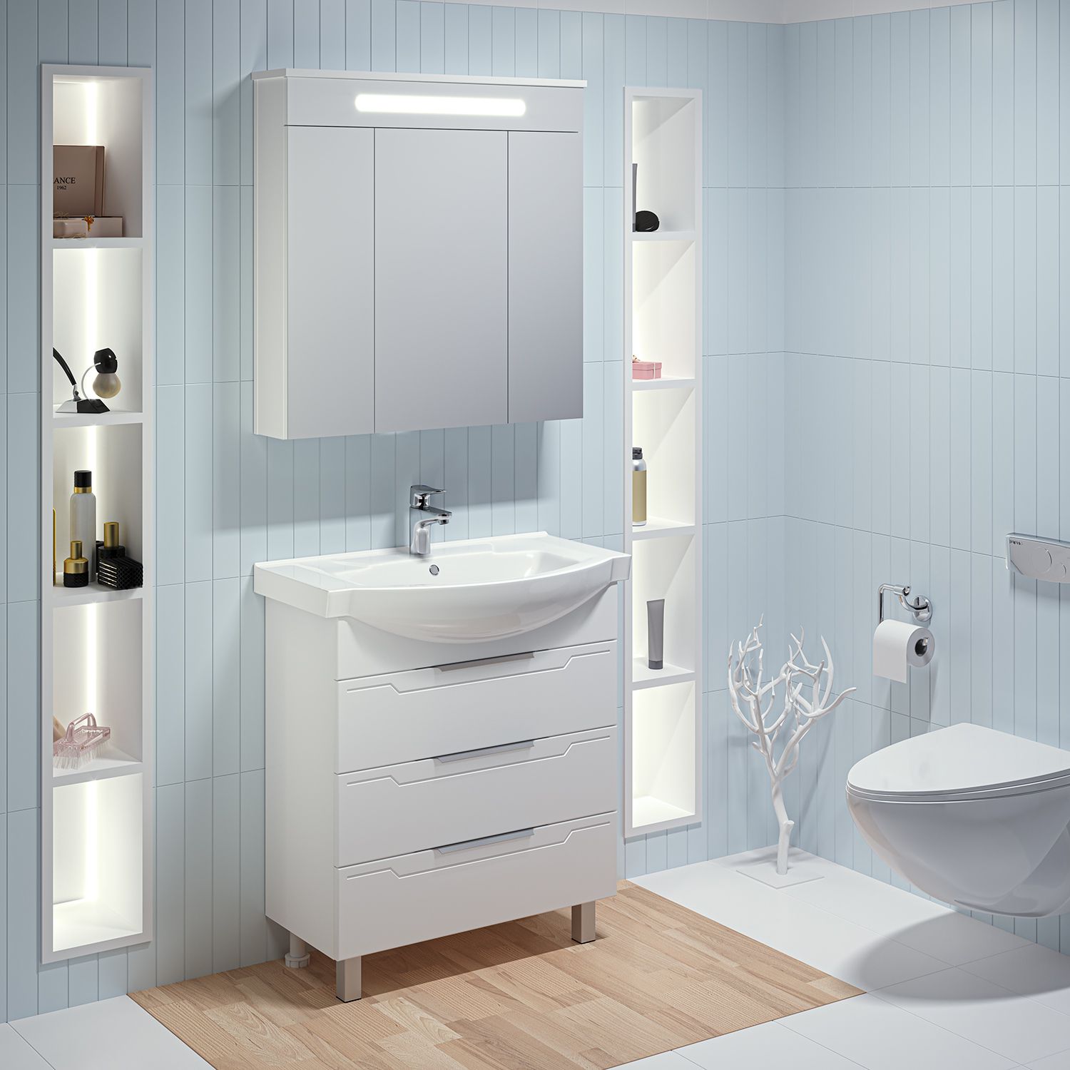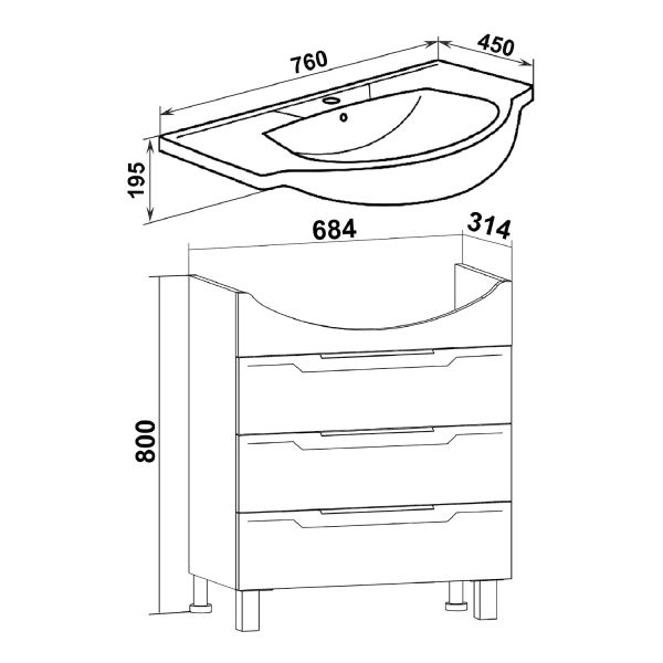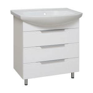 Тумба под умывальник напольная с тремя выдвижными ящиками на шариковых направляющих полного выдвижения. Ручки профильные - 3шт, ножки хром - 2шт, ножки пластик - 2шт.