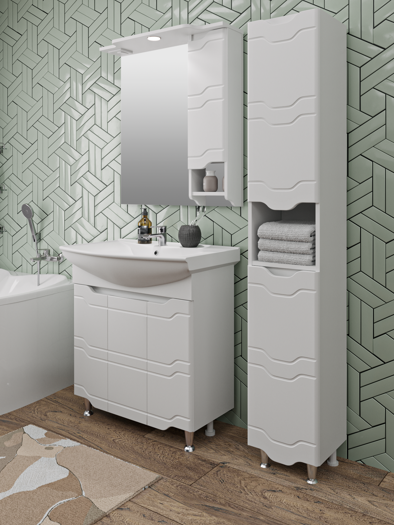 Тумба под умывальник напольная с тремя распашными фасадами и одной внутренней полкой. Петли со встроенным доводчиком, ножки хром - 2шт, ножки пластик -2шт.
