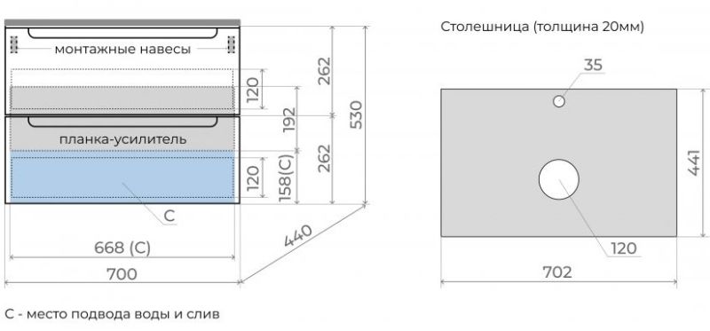 • Тумба подвесная со столешницей (ш/г/в): 700x450x530 мм