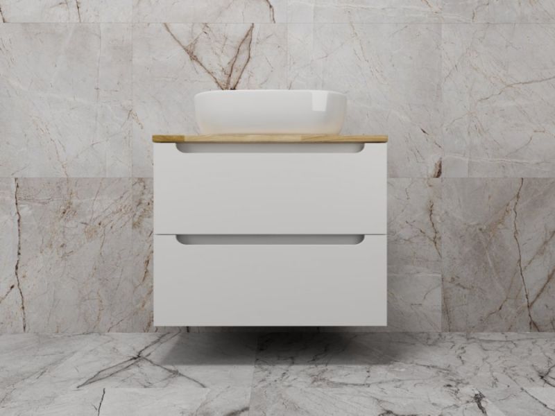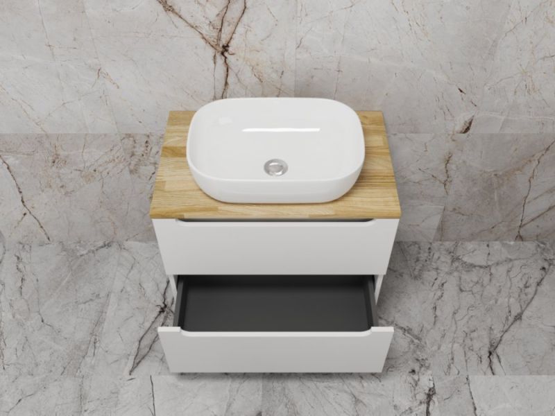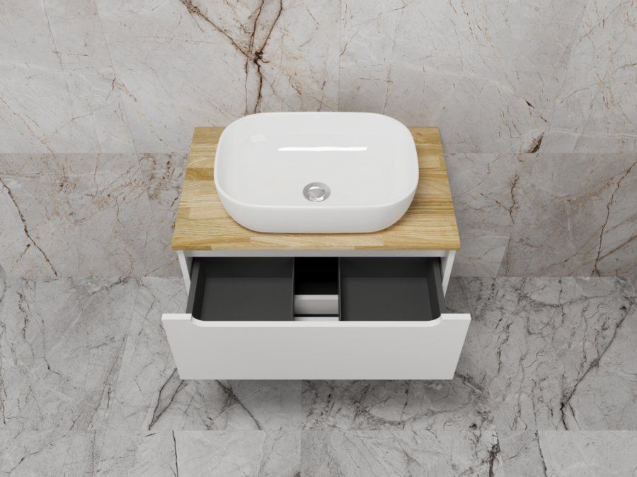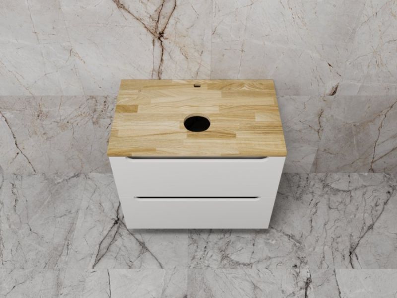 Столешница из натурального ясеня толщиной 20 мм покрыта матовым влагостойким лаком. Фасады и корпус в матовой пленке SOFT TUOCH. Внутренне наполнение из ЛДСП в декоре ГРАФИТ с эргономичным ограничителем под сифон. Фасады без ручек с лаконичным вырезом для комфортного открывания. Выдвижные ящики с системой плавного закрывания SOFT CLOSE. Экологичные и влагостойкие материалы. Легкость в уходе, практичность и стильный внешний вид.