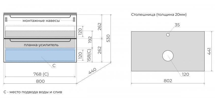 • Тумба подвесная со столешницей (ш/г/в): 800x450x530 мм
