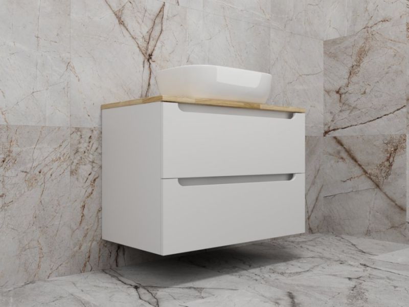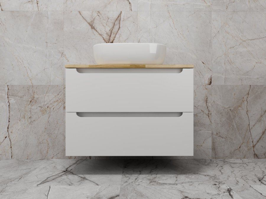 Столешница из натурального ясеня толщиной 20 мм покрыта матовым влагостойким лаком. Фасады и корпус в матовой пленке SOFT TUOCH. Внутренне наполнение из ЛДСП в декоре ГРАФИТ с эргономичным ограничителем под сифон. Фасады без ручек с лаконичным вырезом для комфортного открывания. Выдвижные ящики с системой плавного закрывания SOFT CLOSE. Экологичные и влагостойкие материалы. Легкость в уходе, практичность и стильный внешний вид.