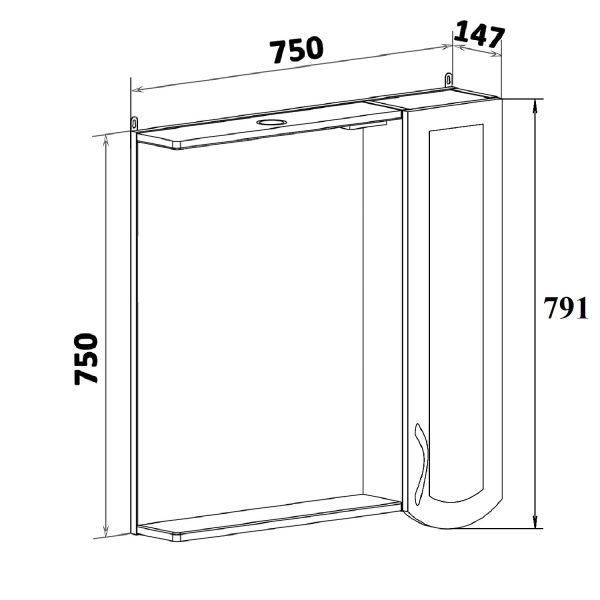 Зеркальный шкаф оборудован одним врезным светодиодным светильником 220В и розеткой с выключателем. Справа - шкафчик с распашной дверцей и двумя внутренними полками. Петли со встроенным доводчиком, ручка - 1шт. Выпускается только в правом исполнении.