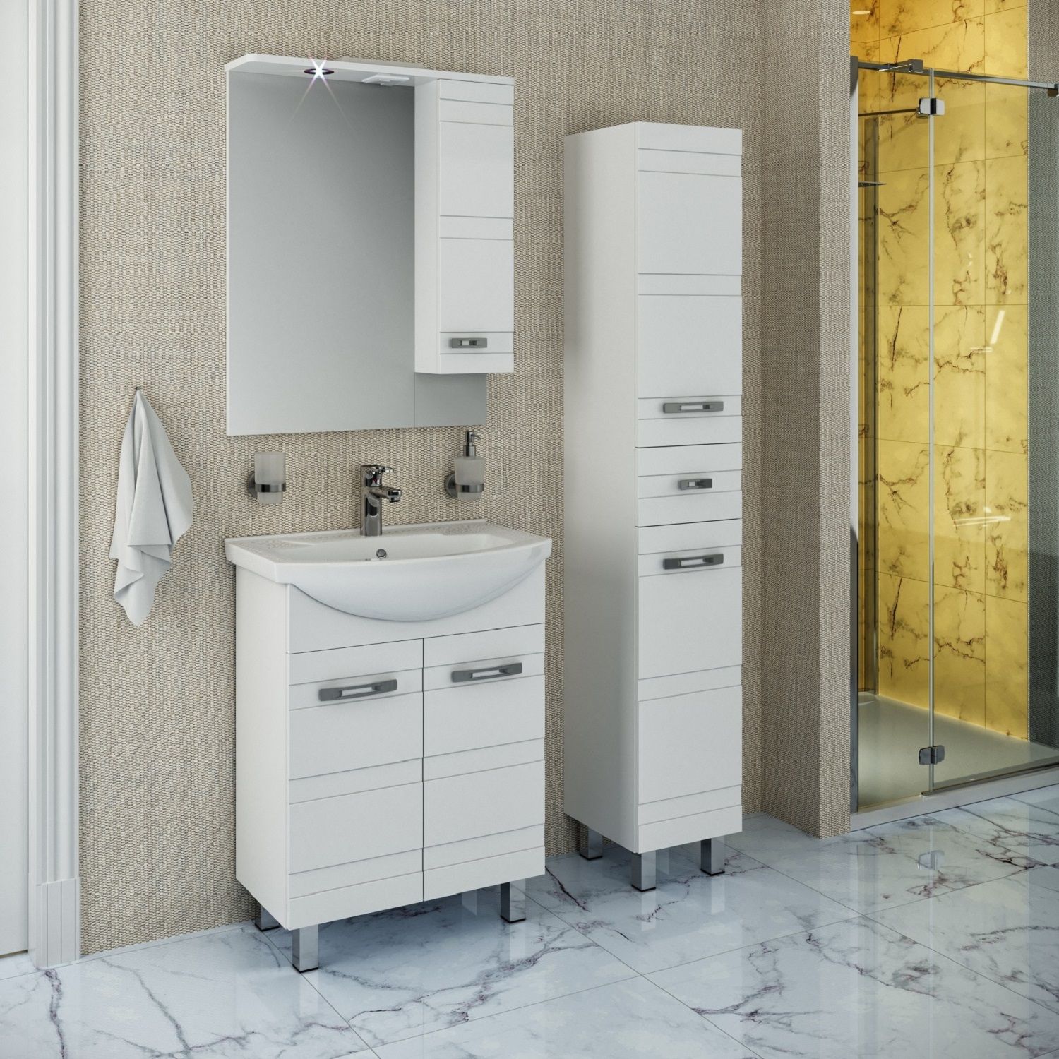 Зеркальный шкаф оборудован одним врезным светодиодным светильником 220В и розеткой с выключателем. Справа - шкафчик с распашной дверцей и одной внутренней полкой. Петли со встроенным доводчиком, ручка - 1шт. Выпускается только в правом исполнении.